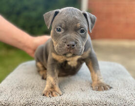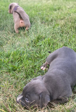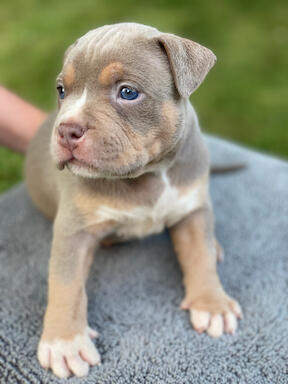 There are 3 girls in the litter. Two champagne tricolors, and one dark/lilac with brindle forearms. The boys barely outnumber the girls, with 2 champagne and 2 lavender blue coats.