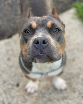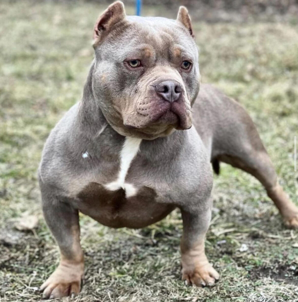 Mom Bella is a beautiful 2-year-old American Bully with a sweet and playful demeanor. Bully Dad Kano shows off his more exotic features.